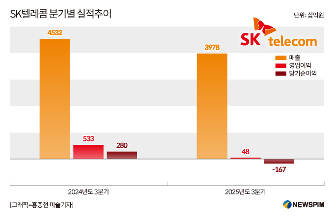 [서울=뉴스핌] 양태훈 기자 = SK텔레콤이 올해 3분기 1069억원의 당기순손실을 기록했다. 사이버 침해 사고 여파로 이동통신 매출이 급감한 가운데, 고객 보상과 요금 할인, 과징금 등 일회성 요인이 악영향을 미친 것으로 보인다. 다만, SK텔레콤은 올 4분기 들어 할인 정책이 종료되고 고객 이탈세도 줄어들면서 연말부터 손익 개선이 나타날 것으로 기대했다.
