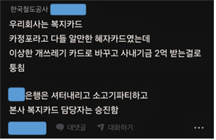 재계약 내용에 따르면 코레일은 직원들에게 돌아가는 카드사 혜택을 축소하는 대신, 매년 3억 원씩 3년간 총 9억 원을 카드사로부터 지급받기로 했다. 다만 코레일은 카드사에게 해당 금액을 '사내근로복지기금'에 입금하도록 했다.