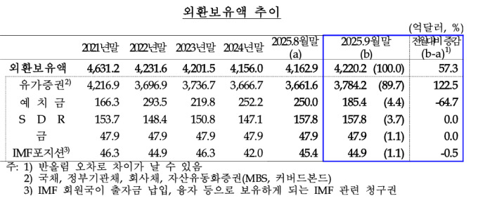 실제 한은은 9월말 외환보유고가 전월에 비해 57.3억 달러가 증가한 것은 운용 수익 증가와 분기말 효과로 인한 금융기관의 예수금 증가 때문이라고 밝혔다. 외환보유고는 22개월만에 4200억 달라러를 넘었다.