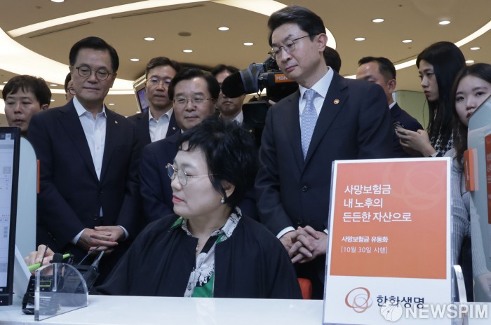[서울=뉴스핌] 양윤모 기자 = 이억원 금융위원장이 30일 오후 서울 중구 한화생명 시청 고객센터를 방문 '사망보험금 유동화' 가입 현장점검을 하고 있다. 정부가 추진해 이날부터 시행된 '사망보험금 유동화' 제도는 기존 사망 시 지급받을 수 있던 사망보험금을 만 55세 이상부터 연금 자산처럼 생전에 미리 지급받을 수 있도록 하는 제도다. 2025.10.30 yym58@newspim.com