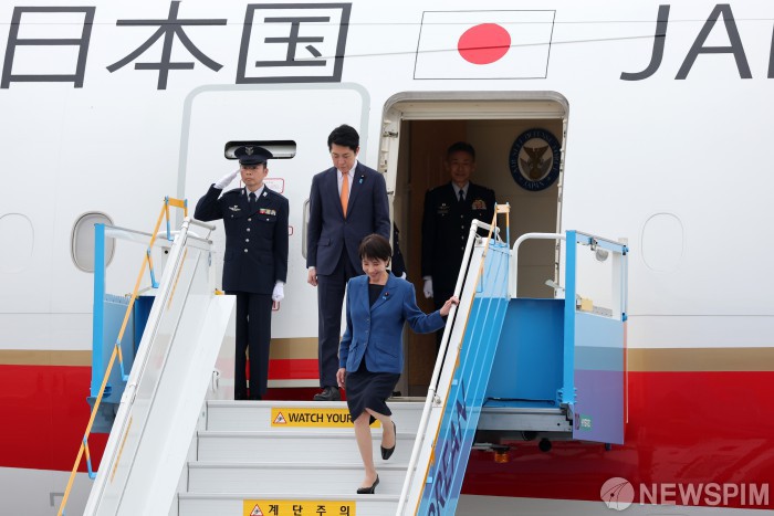 [서울=뉴스핌] 경주 APEC 정상회의 참석을 위해 방한한 다카이치 사나에 일본 총리가 30일 부산 김해국제공항에 도착해 전용기에서 내리고 있다. [사진=APEC 2025 KOREA & 연합뉴스] 2025.10.30 photo@newspim.com
