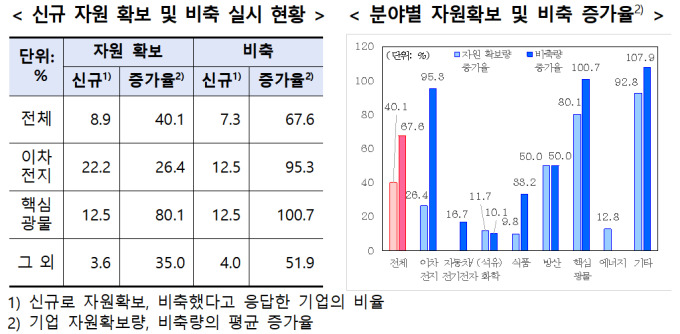 | 신규 자원 확보 및 비축 실시 현황 및 = 분야별 자원확보 및 비축 증가율. [자료=기획재정부] 2025.10.31 plum@newspim.com |