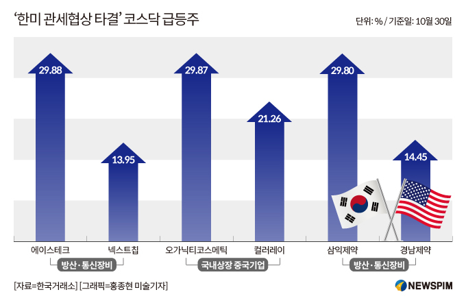 [서울=뉴스핌] 이나영 기자= 한미 정상회담 직후 발표된 관세 협상 타결 소식에 코스닥 시장이 빠르게 반응했다. 자동차 부품, 방위산업, 제약·바이오, 통신장비, 국내 상장 중국기업 등에서 급등세가 나타나며 중소형 종목 중심의 '1·2차 수혜 기대감'이 확산됐다.