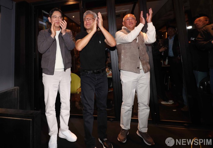 [서울=뉴스핌] 최지환 기자 = 이재용 삼성전자 회장(왼쪽부터)과 젠슨 황 엔비디아 최고경영자(CEO), 정의선 현대차그룹 회장이 30일 저녁 서울 삼성동의 한 치킨집에서 '치맥' 회동을 마친 후 인사를 하고 있다. 2025.10.30 choipix16@newspim.com