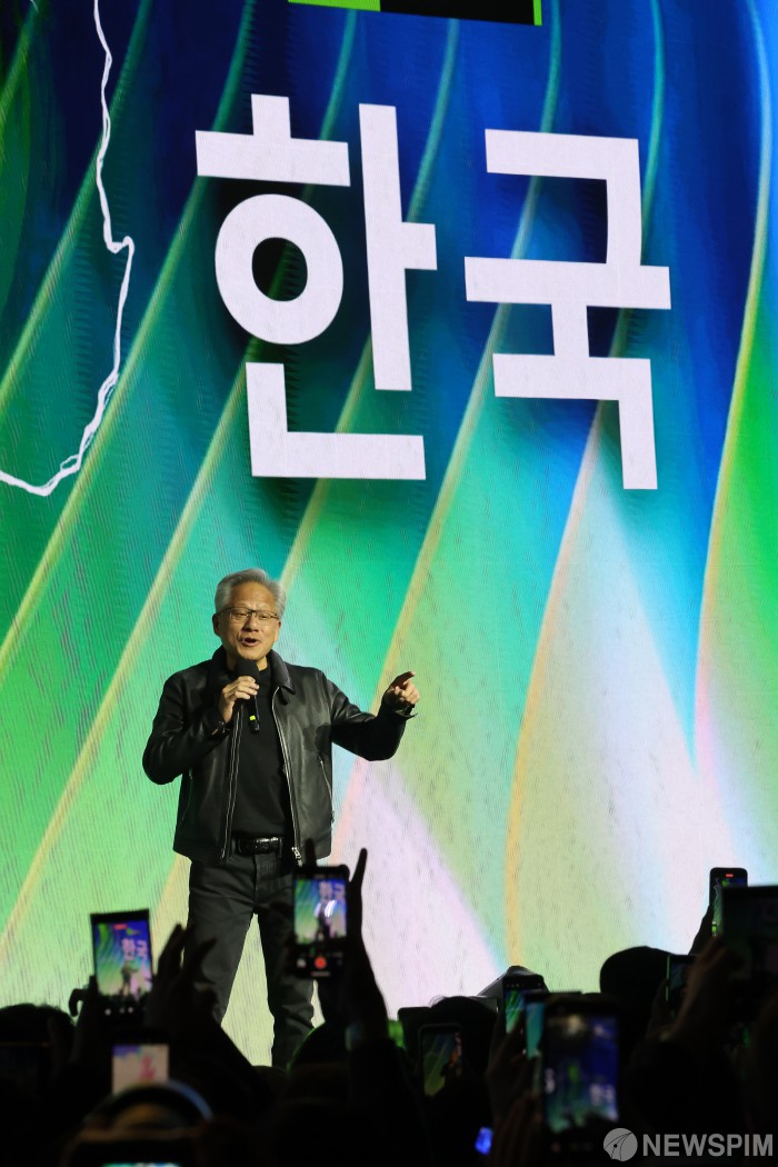[서울=뉴스핌] 최지환 기자 = 젠슨 황 엔비디아 최고경영자(CEO)가 30일 오후 서울 강남구 코엑스에서 열린 엔비디아 그래픽카드(GPU) ‘지포스’의 한국 출시 25주년 행사에 참석해 발언을 하고 있다. 2025.10.30 choipix16@newspim.com