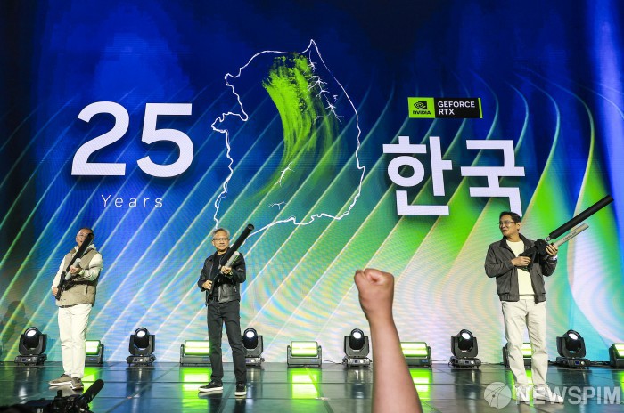 [서울=뉴스핌] 최지환 기자 = 젠슨 황 엔비디아 최고경영자(CEO)와 이재용 삼성전자 회장, 정의선 현대차그룹 회장이 30일 서울 강남구 코엑스에서 열린 엔비디아 지포스 게이머 페스티벌에서 팬들에게 선물을 나눠주고 하고 있다. 2025.10.30 choipix16@newspim.com