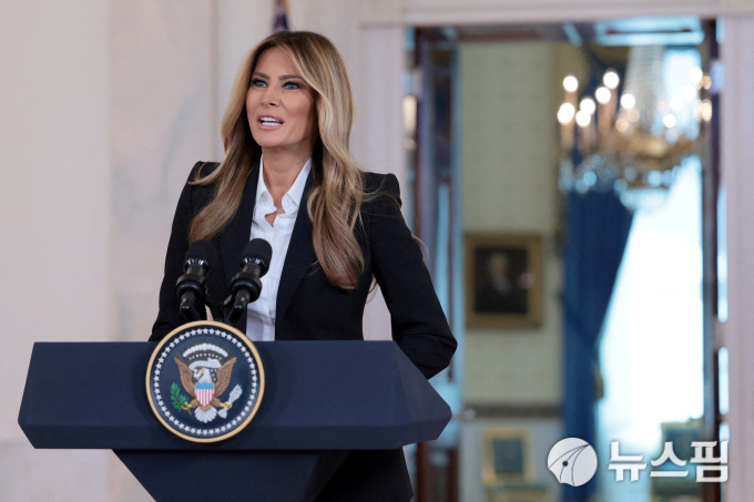 미국 영부인 멜라니아 트럼프 여사가 2025년 10월 10일 워싱턴 D.C. 백악관에서 자신과 러시아 블라디미르 푸틴 대통령이 우크라이나 전쟁으로 인해 영향을 받은 아동에 관해 주고받은 소통에 대해 발표했다. [사진=로이터 뉴스핌]