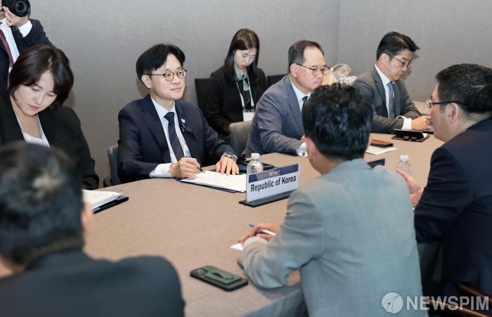 [서울=뉴스핌] 김정관 산업통상부 장관이 31일 경북 경주시 소노캄호텔에서 응우옌 홍 지엔 베트남 산업무역부 장관과 만나 양국 교역·투자 확대 방안과 현지 진출 기업 애로 해소 방안을 논의하고 있다. [사진=산업통상부] 2025.10.31 photo@newspim.com