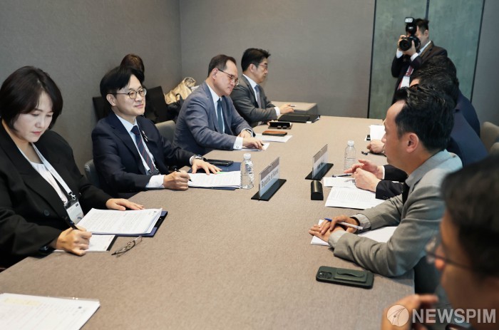 [서울=뉴스핌] 김정관 산업통상부 장관이 31일 경북 경주시 소노캄호텔에서 응우옌 홍 지엔 베트남 산업무역부 장관과 만나 양국 교역·투자 확대 방안과 현지 진출 기업 애로 해소 방안을 논의하고 있다. [사진=산업통상부] 2025.10.31 photo@newspim.com