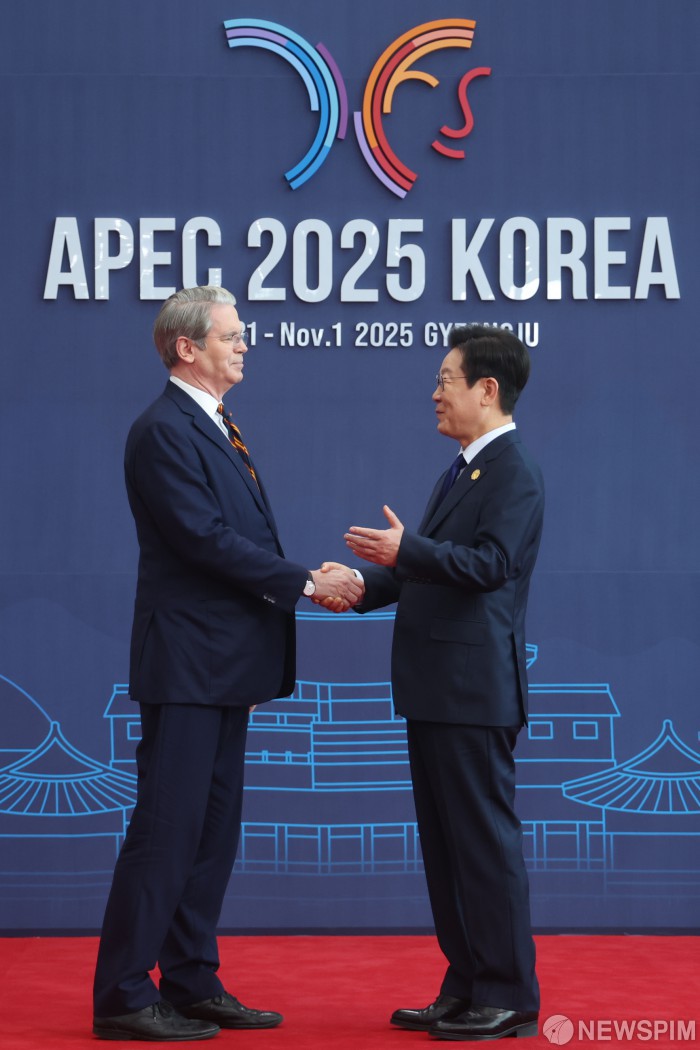 [서울=뉴스핌] 이재명 대통령이 31일 오전 경북 경주시 경주화백컨벤션센터(HICO)에서 열린 2025 아시아태평양경제협력체(APEC) 정상회의에 참석한 스콧 베선트 미국 재무장관을 맞이하고 있다. [사진=APEC 2025 KOREA & 연합뉴스] 2025.10.31 photo@newspim.com