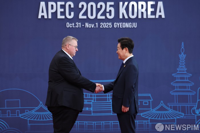 [서울=뉴스핌] 이재명 대통령이 31일 오전 경북 경주시 경주화백컨벤션센터(HICO)에서 열린 2025 아시아태평양경제협력체(APEC) 정상회의에 참석한 알렉세이 오베르추크 러시아 국제부총리를 맞이하고 있다. [사진=APEC 2025 KOREA & 연합뉴스] 2025.10.31 photo@newspim.com