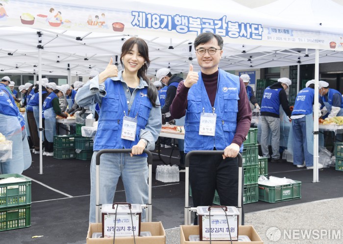 [서울=뉴스핌] 임기근 기획재정부 차관(오른쪽)과 박하선 행복공감봉사단장이 31일 서울 강서구 강서노인종합복지관에서 열린 '제18기 행복공감봉사단 5차 봉사활동'에서 포즈를 취하고 있다. [사진=기획재정부] 2025.10.31 photo@newspim.com
