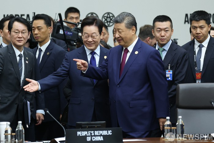 | [서울=뉴스핌] 이재명 대통령이 31일 경주화백컨벤션센터(HICO)에서 열린 2025 아시아태평양경제협력체(APEC) 정상회의 제1세션을 앞두고 시진핑 중국 국가주석의 자리를 안내하고 있다. [사진=APEC 2025 KOREA & 연합뉴스] 2025.10.31 photo@newspim.com |