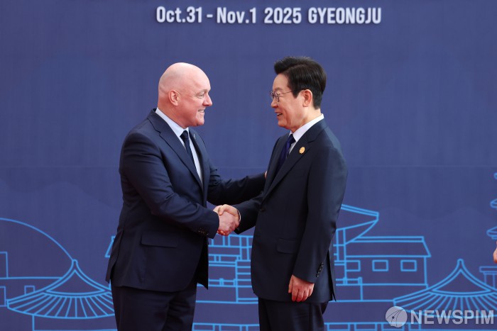 [서울=뉴스핌] 이재명 대통령이 31일 오전 경북 경주시 경주화백컨벤션센터(HICO)에서 열린 2025 아시아태평양경제협력체(APEC) 정상회의에 참석한 크리스토퍼 럭슨 뉴질랜드 총리를 맞이하고 있다. [사진=APEC 2025 KOREA & 연합뉴스] 2025.10.31 photo@newspim.com