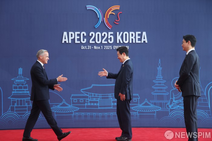 [서울=뉴스핌] 이재명 대통령이 31일 오전 경북 경주시 경주화백컨벤션센터(HICO)에서 열린 2025 아시아태평양경제협력체(APEC) 정상회의에 참석한 마크 카니 캐나다 총리를 맞이하고 있다. [사진=APEC 2025 KOREA & 연합뉴스] 2025.10.31 photo@newspim.com