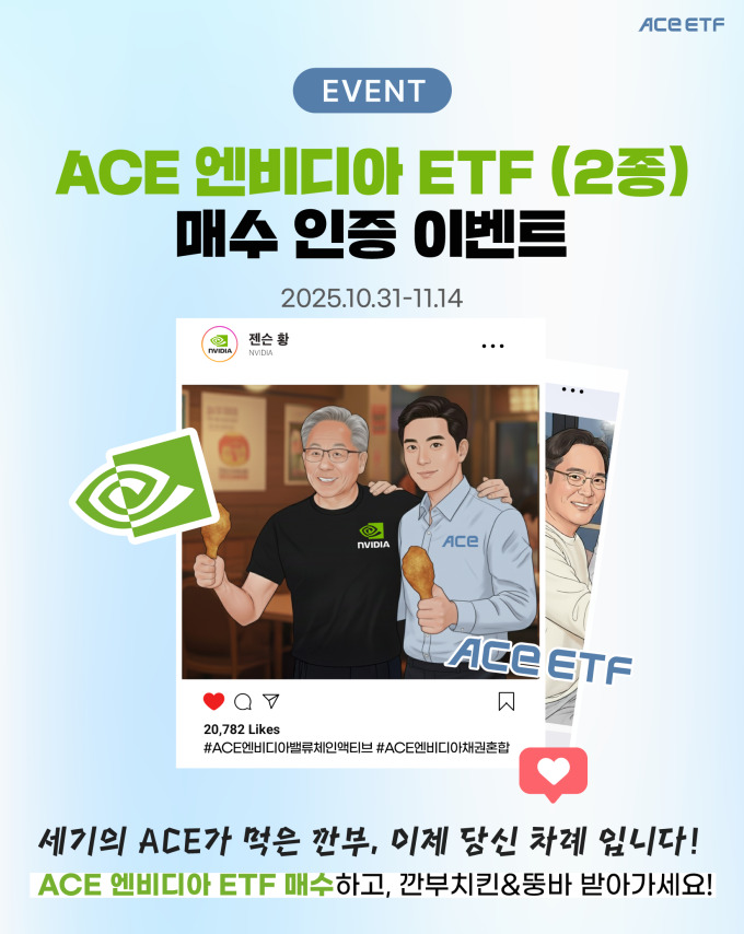 이번 이벤트는 'ACE 엔비디아밸류체인액티브' 또는 'ACE 엔비디아채권혼합'을 10주 이상 신규 매수한 투자자를 대상으로 한다. 매수 내역을 캡처한 뒤 이벤트 응모 링크를 통해 제출하면 추첨을 통해 ▲깐부치킨 크리스피 순살(50명) ▲깐부치킨 마늘간장 순살(50명) ▲빙그레 바나나맛 우유(1000명) 등 경품을 증정한다.