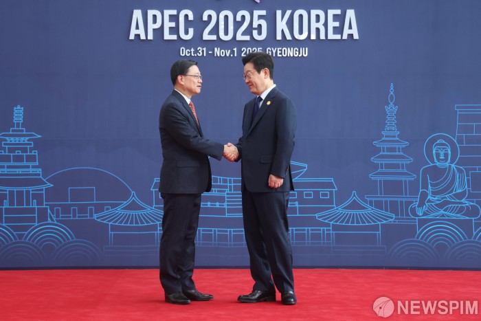 [서울=뉴스핌] 이재명 대통령이 31일 오전 경북 경주시 경주화백컨벤션센터(HICO)에서 열린 2025 아시아태평양경제협력체(APEC) 정상회의에 참석한 존 리 홍콩 행정장관을 맞이하고 있다. [사진=APEC 2025 KOREA & 연합뉴스] 2025.10.31 photo@newspim.com