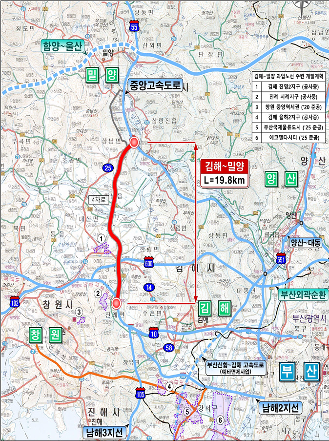 김해~밀양 고속도로는 사업비 1조 4965억 원, 총연장 19.8km 규모로 김해 진례면과 밀양 상남면을 잇는 노선이다.