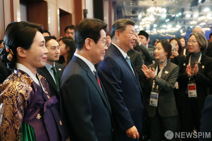 [서울=뉴스핌] 이재명 대통령과 김혜경 여사, 시진핑 중국 국가주석이 31일 경북 경주의 한 호텔에서 열린 APEC 정상회의 환영 만찬에 참석하고 있다. [사진=APEC 2025 KOREA & 연합뉴스] 2025.10.31 photo@newspim.com