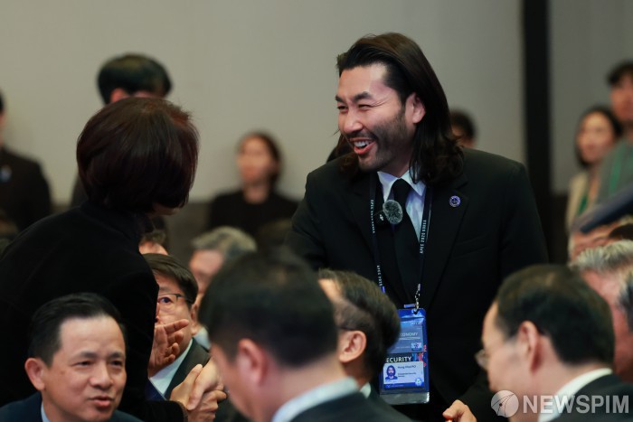 [서울=뉴스핌] 방송인 노홍철이 31일 경북 경주의 한 호텔에서 열린 APEC 정상회의 환영 만찬에서 인사를 나누고 있다. [사진=APEC 2025 KOREA & 연합뉴스] 2025.10.31 photo@newspim.com