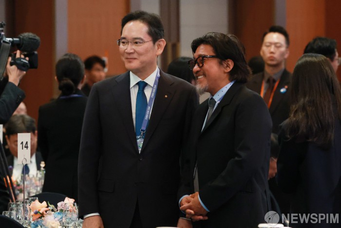 [서울=뉴스핌] 이재용 삼성전자 회장과 에드워드 리 쉐프가 31일 경북 경주의 한 호텔에서 열린 APEC 정상회의 환영 만찬에서 미소를 짓고 있다. [사진=APEC 2025 KOREA & 연합뉴스] 2025.10.31 photo@newspim.com