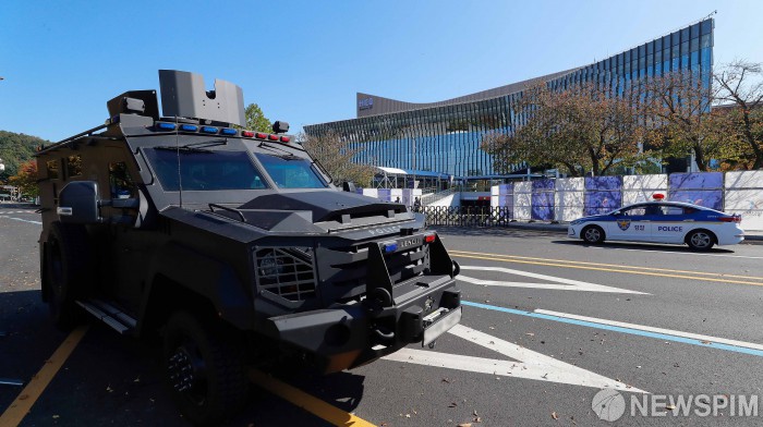 [경주=뉴스핌] 류기찬 기자 = 아시아태평양경제협력체(APEC) 정상회의 폐막일인 1일 오전 경북 경주시 경주화백컨벤션센터(HICO) 인근에서 경찰 관계자들이 근무를 서고 있다 2025.11.01 ryuchan0925@newspim.com