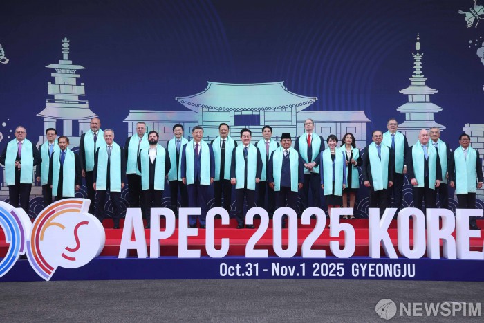[서울=뉴스핌] 이재명 대통령이 1일 경주화백컨벤션센터(HICO)에서 열린 2025 아시아태평양경제협력체(APEC) 정상회의에서 각국 정상들과 한복 소재로 만든 목도리를 두르고 기념 촬영을 하고 있다. [사진=APEC 2025 KOREA & 연합뉴스] 2025.11.01 photo@newspim.com