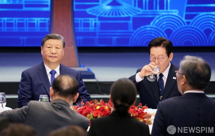 [서울=뉴스핌] 이재명 대통령과 시진핑 중국 국가주석이 1일 경북 경주 소노캄 호텔에서 열린 한중 정상 국빈 만찬에 자리 하고 있다. [사진=APEC 2025 KOREA & 연합뉴스] 2025.11.01 photo@newspim.com