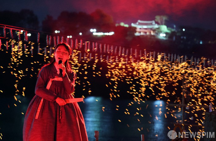 [서울=뉴스핌] 양윤모 기자 = 1일 오후 여주시 남한강변 신륵사 관광지 일원에서 열린 '2025 여주오곡나루축제' 뱃놀이장에서 오곡낙화가 화려하게 펼쳐지고 있다. ‘여주의 전통과 풍요를 세계와 함께 나누는 축제’라는 주제로 열린 올해 축제는, 기존의 대표 프로그램에 글로벌 교류와 디지털 감성을 더한 콘텐츠가 대폭 확대되어 열렸다. [사진=여주시청] 2025.11.02 yym58@newspim.com