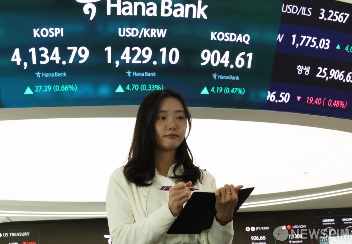 [서울=뉴스핌] 이길동 기자 = 3일 오전 서울 중구 하나은행 딜링룸에 코스피-코스닥 지수 및 달러/원 환율이 표시되어 있다. 이날 코스피는 전 거래일보다 15.86p(0.39%) 오른 4123.36에 코스닥 지수는 전 거래일보다 5.77p(0.64%) 오른 906.19에 거래를 시작했다. 서울 외환시장에서 달러/원 환율은 전거래일 대비 3.8원 상승한 1428.2원에 개장했다.2025.11.03.gdlee@newspim.com