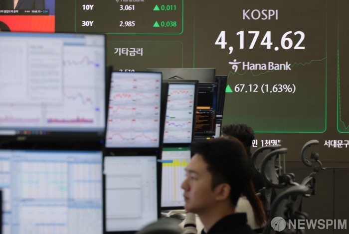 [서울=뉴스핌] 이길동 기자 = 3일 오전 서울 중구 하나은행 딜링룸에 코스 지수가 표시되어 있다. 이날 코스피는 전 거래일보다 15.86p(0.39%) 오른 4123.36에 코스닥 지수는 전 거래일보다 5.77p(0.64%) 오른 906.19에 거래를 시작했다. 서울 외환시장에서 달러/원 환율은 전거래일 대비 3.8원 상승한 1428.2원에 개장했다.2025.11.03.gdlee@newspim.com