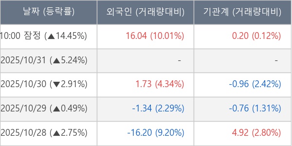 [서울=뉴스핌] 로보뉴스 = 03일 10시 15분 현재 필옵틱스(161580)는 외국인과 기관이 각각 16.04 만 주, 0.20 만 주 순매수(잠정) 하면서 전일 대비 14.45% (현재가 48,300원) 상승하고 있다.