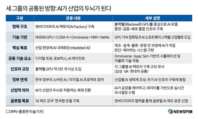 세 그룹 모두 엔비디아의 쿠다-엑스(CUDA-X), 옴니버스(Omniverse), NIM((NVIDIA Inference Microservice), 네모(NeMo), 아이작 심(Isaac Sim) 등 AI 소프트웨어 스택을 산업 현장에 도입한다. 이를 통해 공장·물류·설계 데이터가 AI 모델로 직접 연결되고, AI는 생산성을 극대화하는 방향으로 공정을 자동 최적화한다. 삼성은 반도체 제조, SK는 AI 클라우드, 현대차는 모빌리티와 로보틱스라는 각자의 산업 영역을 기반으로 'AI가 스스로 작동하는 산업 체계'를 구축한다.