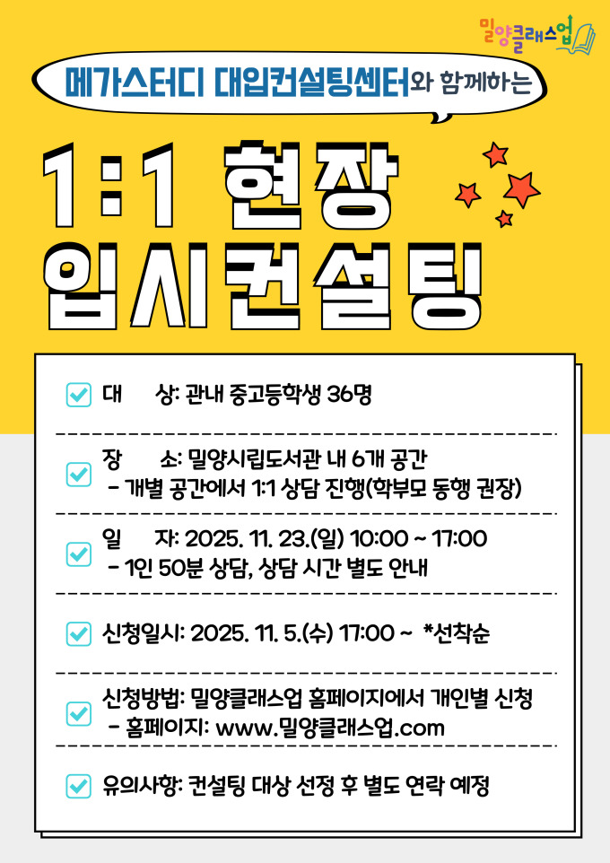 | 경남 밀양시 '1:1 현장 입시컨설팅' 홍보물 [사진=밀양시] 2025.11.03 |