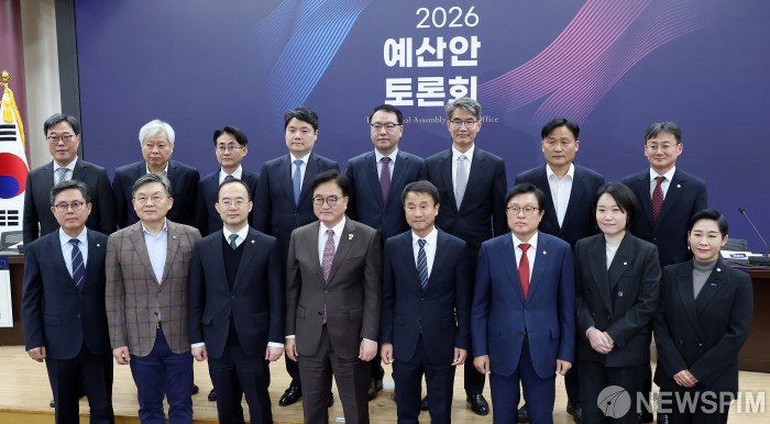 [서울=뉴스핌] 정일구 기자 = 우원식 국회의장과 한병도 국회 예산결산특별위원장, 지동하 국회예산정책처장 등 참석자들이 3일 오후 서울 여의도 국회 의원회관에서 열린 2026년도 예산안 토론회에서 기념촬영을 하고 있다. 2025.11.03 mironj19@newspim.com