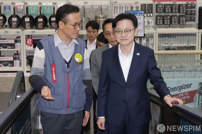 [서울=뉴스핌] 양윤모 기자 = 김정관 산업부 장관이 3일 오후 '코리아그랜드 페스티벌(Korea Grand Festival)'주간을 맞아 서울 중구 롯데마트 제타플렉스 서울역점을 찾아 현장점검을 위해 이동하고 있다. 2025.11.03 yym58@newspim.com