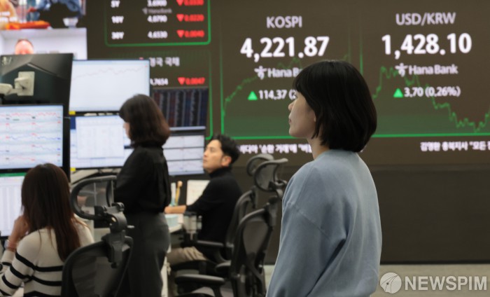 [서울=뉴스핌] 이길동 기자 = 3일 서울 중구 하나은행 딜링룸에 코스피 지수및 달러/원 환율이 표시되어 있다. 이날 코스피는 전 거래일보다 114.37p(2.78%) 오른 4,221.87에 코스닥 지수는 전 거래일보다 14.13p(01.57%) 오른 914.55에 거래를 마감했다. 서울 외환시장에서 달러/원 환율은 전 거래일 주간거래 종가 대비 3.50원 상승한 1,427.90원에 주간 거래를 마감했다.2025.11,03 gdlee@newspim.com