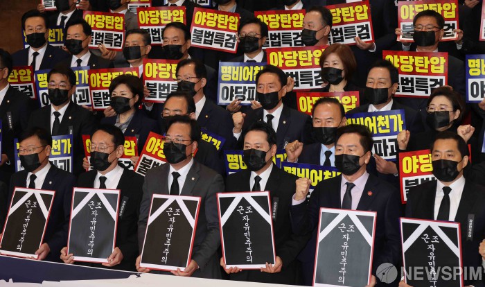 [서울=뉴스핌] 윤창빈 기자 = 국민의힘 장동혁 대표와 송언석 원내대표를 비롯한 의원들이 4일 서울 여의도 국회 로텐더홀 계단에서 "명비어천가 야당파괴", "야당탄압 불법특검"이라고 적힌 피켓을 들고 있다. 2025.11.04 pangbin@newspim.com