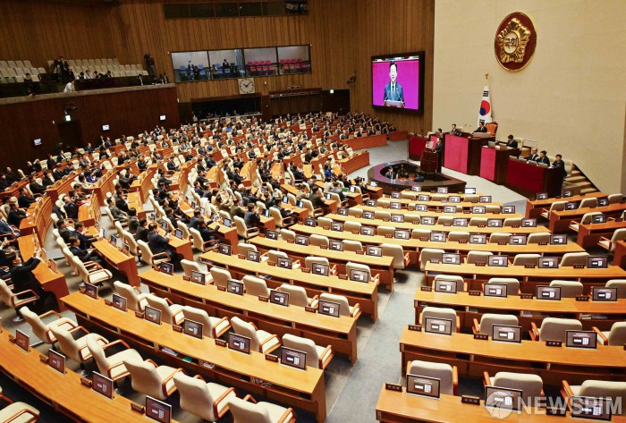 [서울=뉴스핌] 윤창빈 기자 = 이재명 대통령이 4일 여의도 국회에서 내년도 정부 예산안에 대한 시정연설을 하고 있다. 국민의힘은 불참했다. 2025.11.04 pangbin@newspim.com