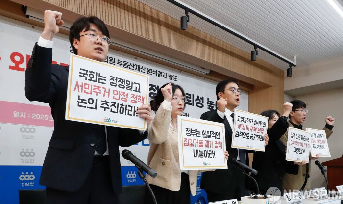 [서울=뉴스핌] 류기찬 기자 = 경제정의실천시민연합 관계자들이 4일 오전 서울 종로구 경실련 강당에서 열린 '22대 국회의원 부동산재산 분석결과 발표 기자회견'에서 구호를 외치고 있다. 2025.11.04 ryuchan0925@newspim.com