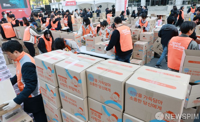 [서울=뉴스핌] 김학선 기자 = 2025 굿피플 사랑의 희망박스 박싱데이 행사가 열린 4일 오전 서울 중구 청계광장에서 참가자들이 희망박스에 물품을 담고 있다. 이날 행사를 통해 취약계층 2만5000가구에 생필품을 담은 '사랑의 희망박스'가 전달될 예정이다. 2025.11.04 yooksa@newspim.com