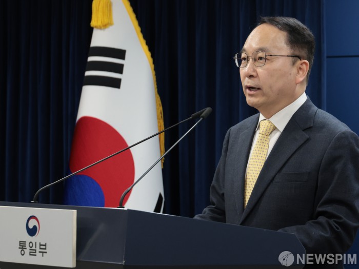 [서울=뉴스핌] 이길동 기자 = 구병삼 통일부 대변인이 4일 오전 정부서울청사에서 김영남 북한 전 최고인민회의 상임위원장 사망 관련 통일부 장관 명의의 조의문을 발표하고 있다.2025.11.04. gdlee@newspim.com