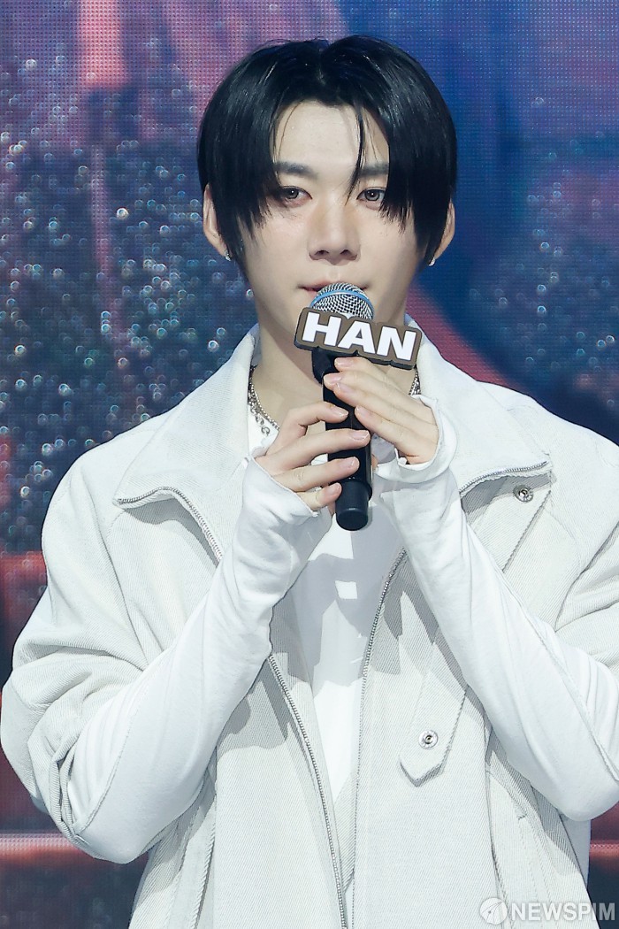 [서울=뉴스핌] 류기찬 기자 = 보이그룹 아홉(AHOF) 멤버 박한이 4일 오후 서울 광진구 예스24라이브홀에서 열린 미니2집 ‘The Passage' 발매 기념 미디어 쇼케이스에서 인사말을 하고 있다. 타이틀곡인 '피노키오는 거짓말을 싫어해’는 동화 피노키오를 모티브 한 밴드 사운드의 곡으로 변덕과 불안, 흔들림 속에서도 ‘너’에게만은 솔직하고 싶은 마음을 아홉만의 감성으로 풀어낸 곡이다. 2025.11.04 ryuchan0925@newspim.com