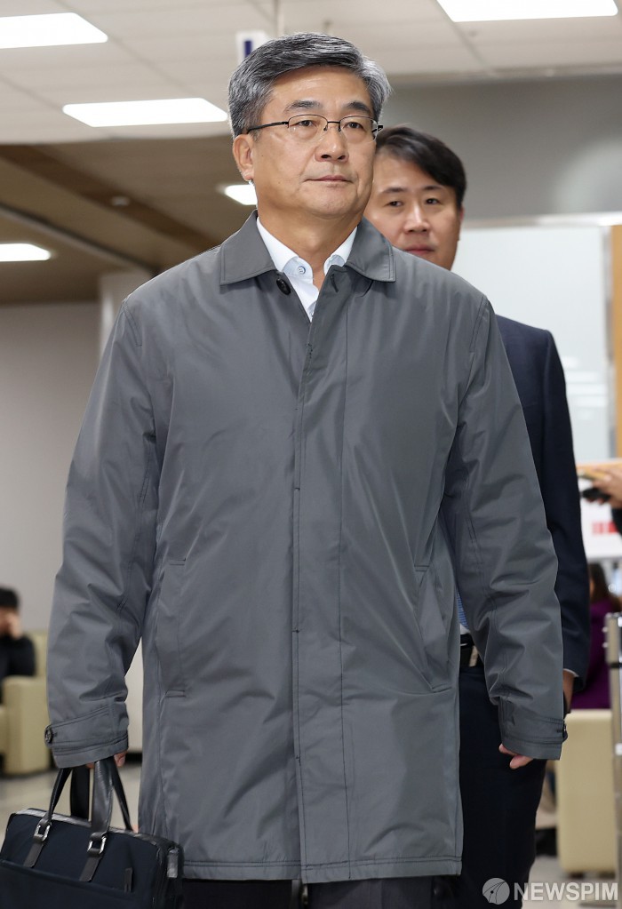[서울=뉴스핌] 정일구 기자 = 2020년 서해 공무원 피격 사건 은폐 혐의로 기소된 서욱 전 국방부 장관이 5일 오전 서울 서초구 서울중앙지방법원에서 열린 1심 결심 공판에 출석하고 있다. 2025.11.05 mironj19@newspim.com