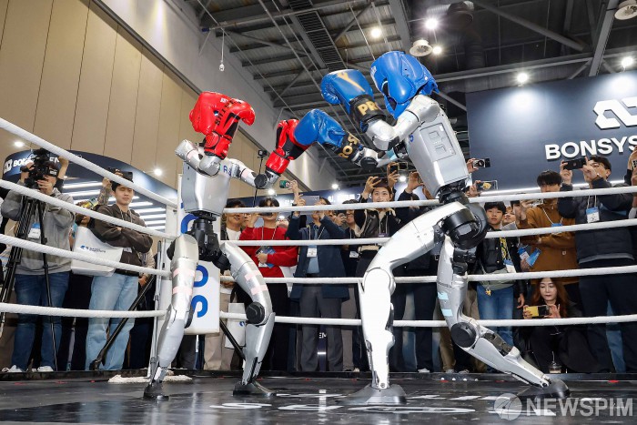 [고양=뉴스핌] 류기찬 기자 = 5일 오후 경기 고양시 킨텍스 제1전시장에서 열린 국내 최대 로봇산업 전시회 ‘2025 로보월드’에서 복싱 로봇들이 경기를 하고 있다. 이번 전시는 국내 최대 첨단기술 전시회 '대한민국 첨단기술 대전(RAD KOREA WEEK)'의 일환으로 개최되며, 로보월드, 디지털미디어테크쇼, 디지털퓨처쇼, 드론도심항공 모빌리티 박람회가 동시에 이루어진다. 2025.11.05 ryuchan0925@newspim.com