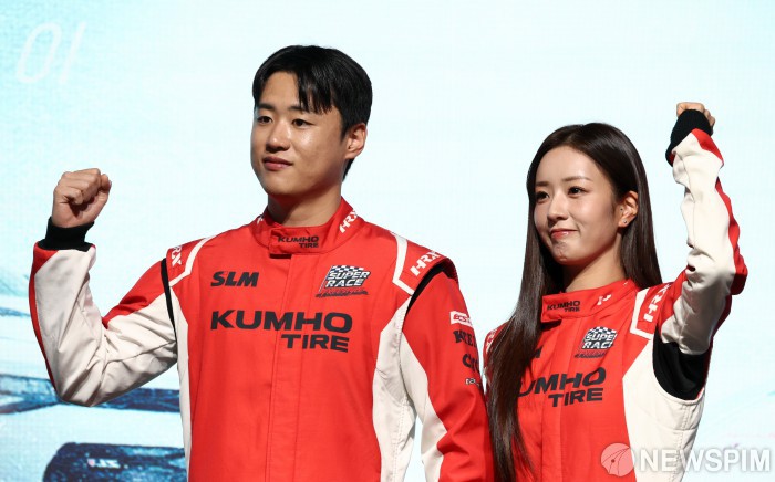 [서울=뉴스핌] 최지환 기자 = 팀 금호타이어 이창욱 선수, 에이핑크 멤버 윤보미가 5일 오후 서울 중구 웨스틴조선 서울에서 열린 슈퍼레이스 프리스타일 제작발표회에서 포즈를 취하고 있다. 오는 7일 첫 공개를 앞둔 티빙 오리지널 슈퍼레이스 프리스타일은 '2025 오네 슈퍼레이스 챔피언십'을 무대로 국내 촤정상급 드라이버들이 우승을 향해 도전하는 카레이싱 예능이다. 2025.11.05 choipix16@newspim.com