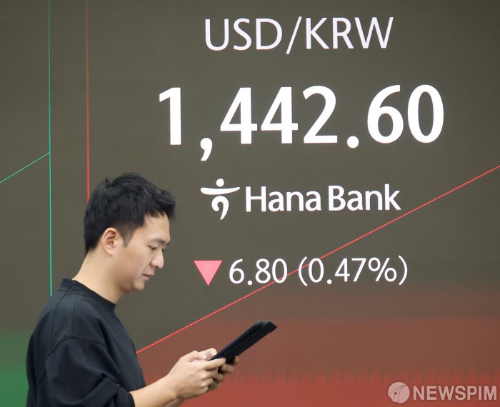 [서울=뉴스핌] 류기찬 기자 = 6일 오전 서울 중구 하나은행 딜링룸 전광판에 달러/원 지수가 표시되고 있다. 이날 코스피 지수는 전장 대비 88.04포인트(2.20%) 오른 4092.46에, 코스닥 지수는 13.54포인트(1.50%) 오른 915.43에 장을 시작했다. 달러/원 환율은 전장보다 7.40원 내린 1442.00으로 출발했다. 2025.11.06. ryuchan0925@newspim.com