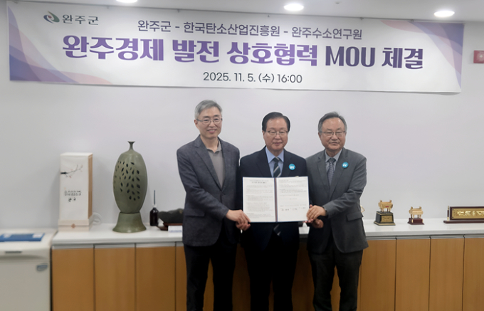 [세종=뉴스핌] 김기랑 기자 = 한국탄소산업진흥원이 완주군·완주수소연구원과 손잡고 수소·탄소 융복합 산업 생태계 조성에 나섰다. 기술개발 역량과 지역 자원을 결합해, '수소경제 선도도시'로 도약 중인 완주군의 산업 경쟁력 강화에 속도를 낼 계획이다.