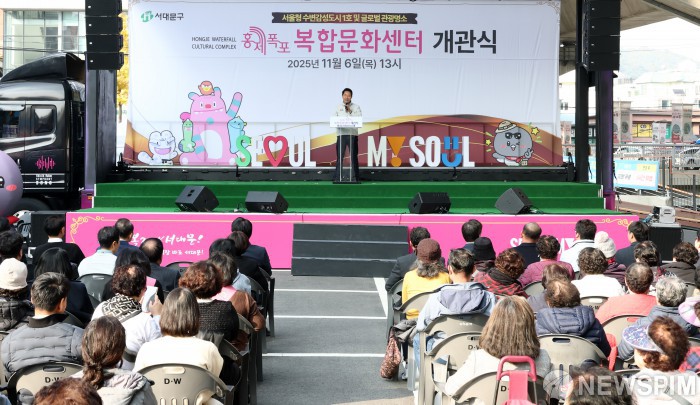 [서울=뉴스핌] 최지환 기자 = 오세훈 서울시장이 6일 오후 서울 서대문구 홍제폭포 복합문화센터 앞에서 열린 홍제폭포 복합문화센터 개관식에서 축사를 하고 있다. 2025.11.06 choipix16@newspim.com