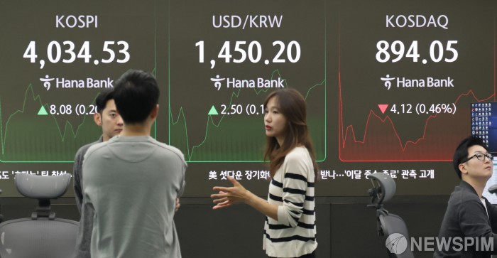 [서울=뉴스핌] 양윤모 기자 = 뉴욕증시가 'AI 거품' 우려 재개에 하락 마감한 가운데, 7일 오전 코스피가 전장 종가보다 8.08 포인트(0.20%) 상승하며 4034.53으로, 코스닥은 3.12 포인트(0.46%) 하락한 894.05로 장을 시작한 가운데, 서울 중구 하나은행 딜링룸에서 직원들이 업무를 보고 있다. 서울외환시장에서 달러/원 환율은 전장 대비 2.50원 상승한 1450.20원에 거래를 시작했다. 2025.11.07 yym58@newspim.com